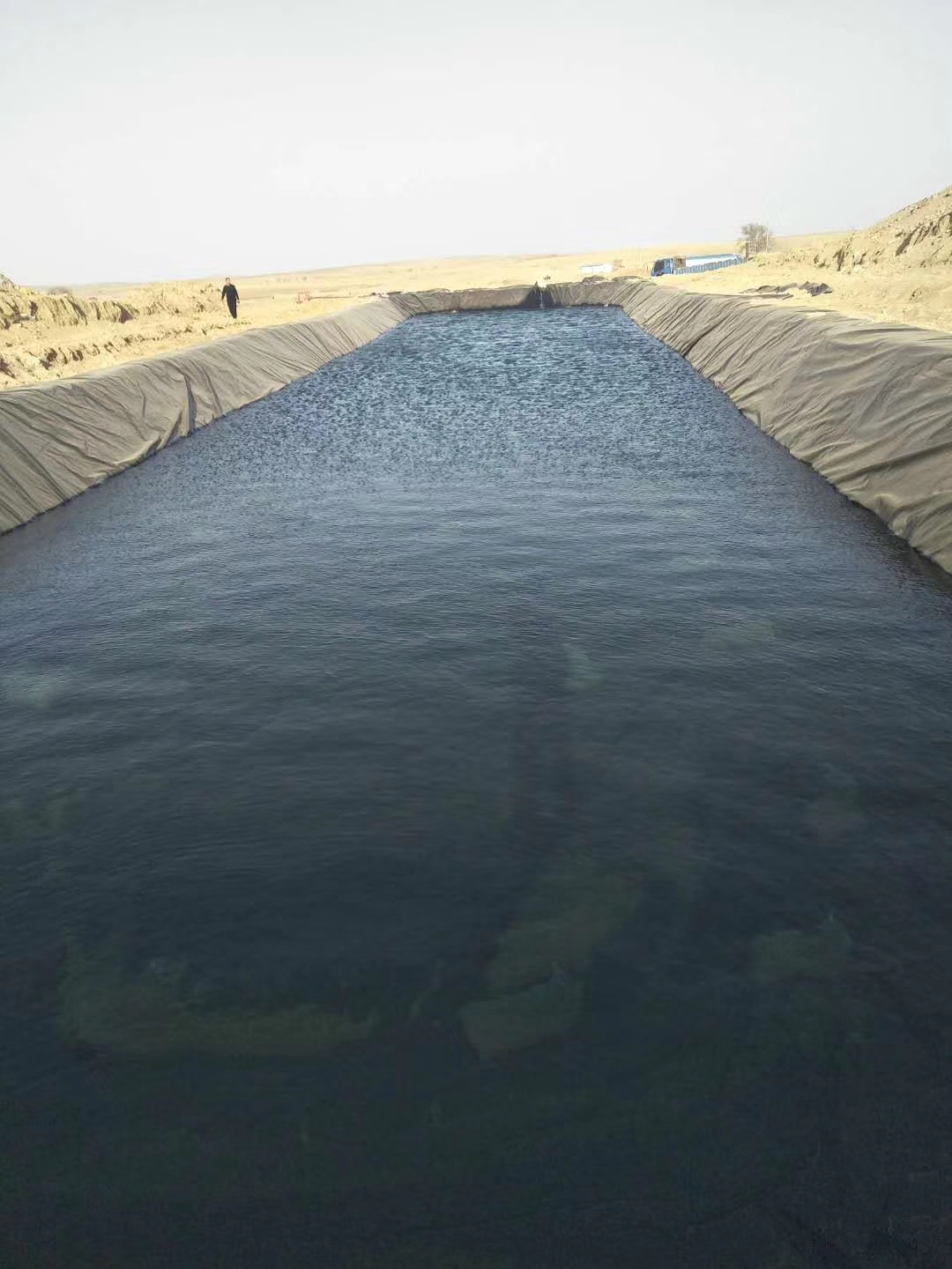 HDPE防渗膜、膨润土防水毯应铺设平顺,边坡上的接缝须与坡面的坡向平行,场底横向接缝须距坡脚应大于1.5m,搭接宽度符合设计和规范要求。