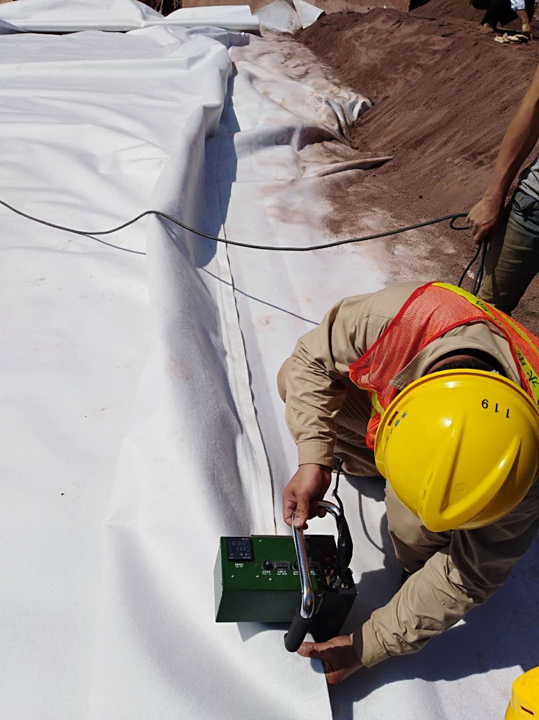 复合土工膜铺设一般采用波浪形松弛铺设型式,富余度约为1.5%,随堤基填筑时协调施工,对于复合土工膜上下面侧的填料严格控制粒径组成,一般采用粘土,不允许内含尖角碎石或块石,以防刺破膜体。摊开后及时拉平%拉开,要求复合土工膜与坡面吻合平整,无突起褶皱,施工人员应穿平底布鞋或软胶鞋,严禁穿钉鞋,以免踩坏土工膜,施工时如发现土工膜损坏,应及时修补。复合土工膜一次粘接长度控制在50m左右,以便于人工搬运、铺设,加工好的复合土工膜沿防渗墙轴线方向卷成卷存放,以便于施工,减少作业场地。