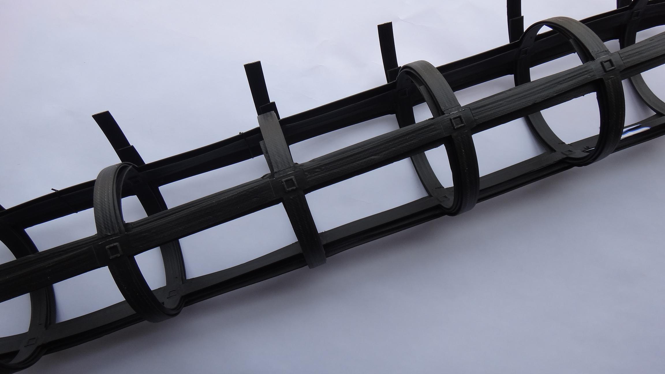 钢塑复合土工格栅以高强钢丝(或其他纤维),经特殊处理,与聚乙烯(PE),并添加其他助剂,通过挤出使之成为复合型高强抗拉条带,且表面有粗糙压纹,则为高强度加筋土工带。由此单带,经纵、横按一定间距编制或夹合排列,采用特殊强化粘接的熔焊技术焊接其交接点而成型,则为加筋土工格栅。